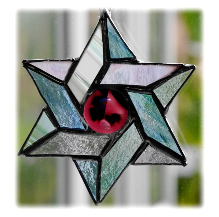 The star is 13cms in diameter and hangs from a little silvery chain which is securely attached to the top of the suncatcher.