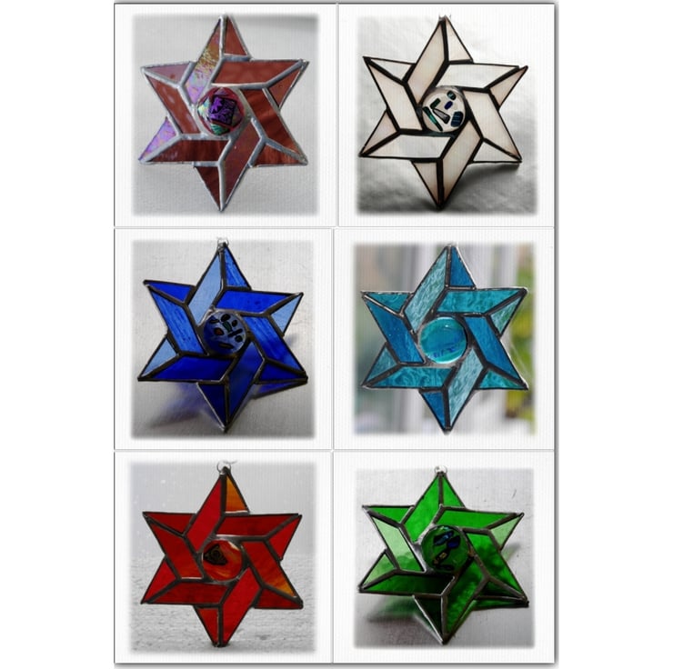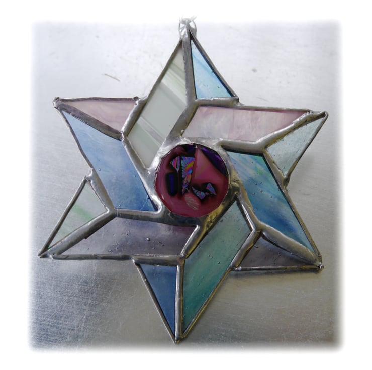 A Star of David in 6 pastel colours and textures of glass formed from, 2 intertwined Celtic triangles. I have filled the centre with a glob decorated with Dichroic glass which I fused specially in my glass kiln. These are all individual and make the stars extra special,
