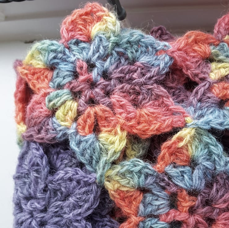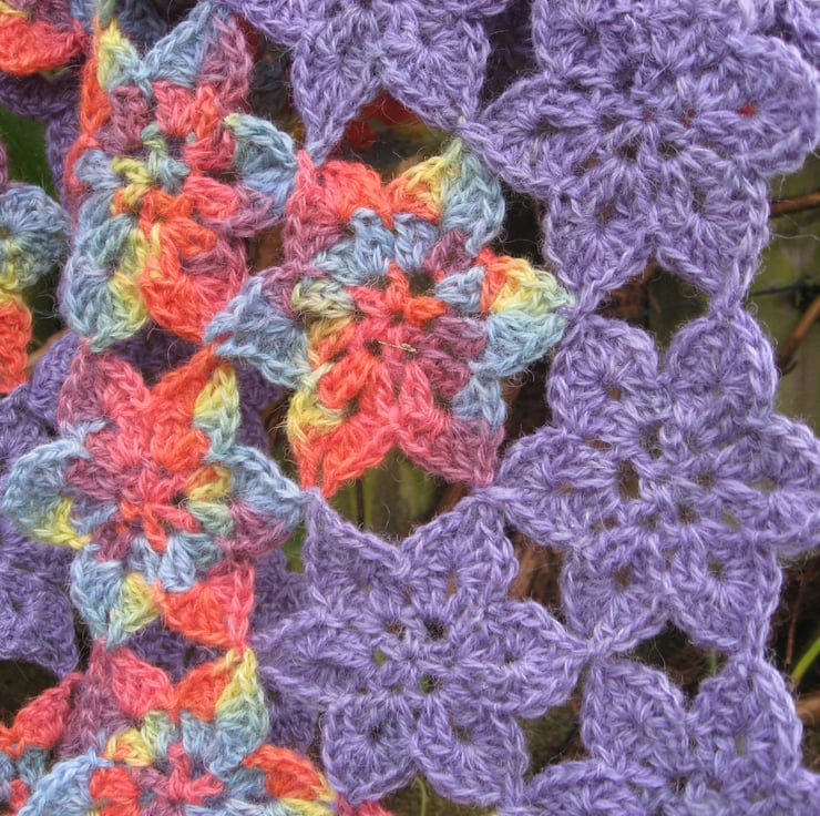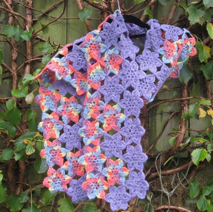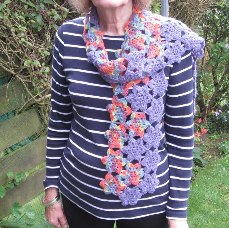 It measures a generous 68 inches (about 173 cms) long and 7.5 inches (19 cms) wide. It is made from 67 flowers joined together. I have really enjoyed making this scarf and I am sure you would enjoy wearing it. You will certainly receive compliments on it! Wear it on a cool summer's day or evening as well as in the middle of winter.