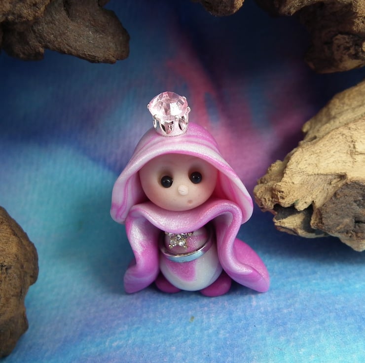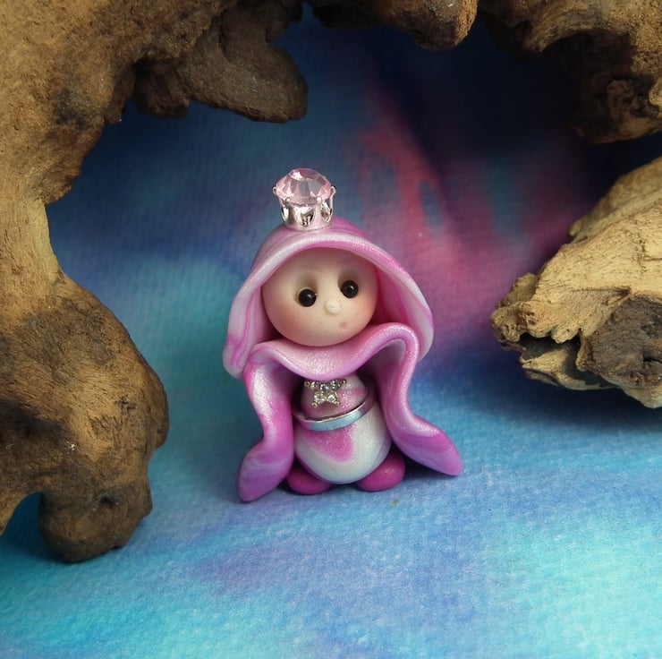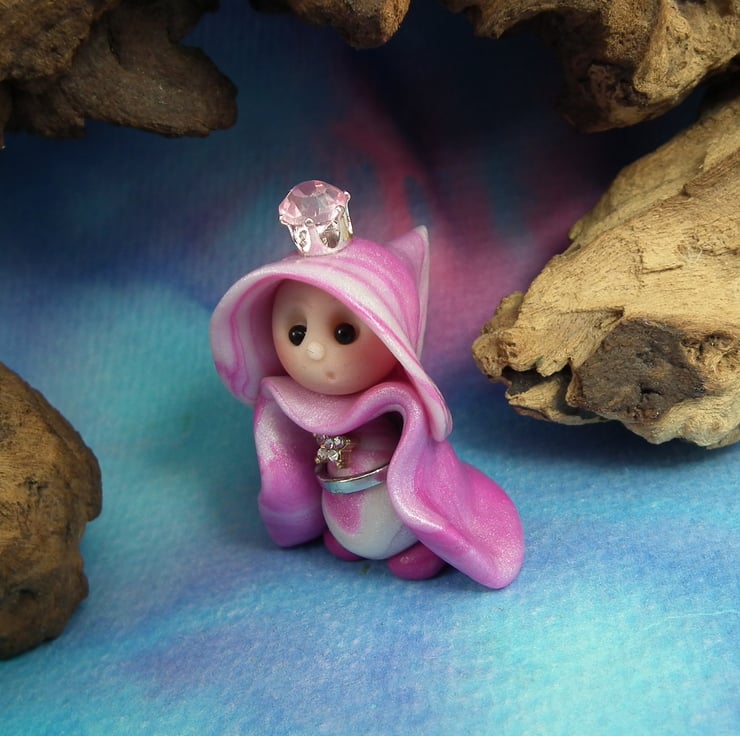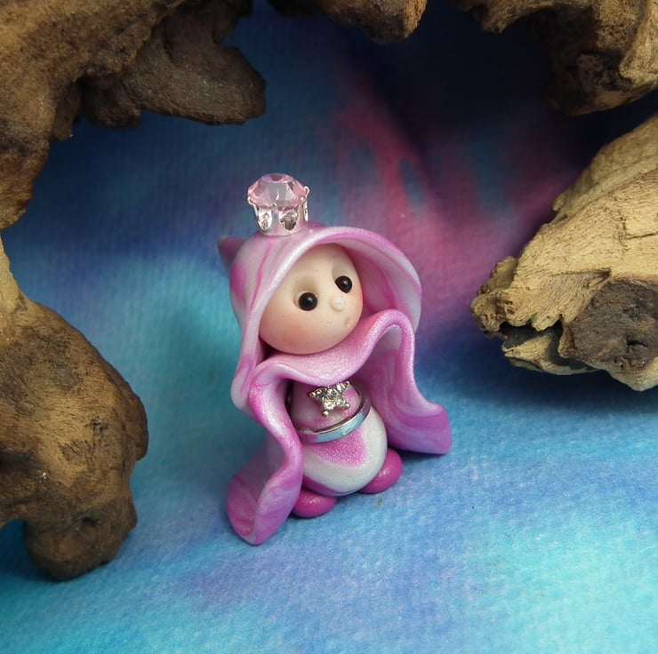 This is a 'one of a kind' creation having been entirely handmade without the use of moulds here at my studio on the Sussex Coast. Modelled with Prosculpt polymers, painted with heat set paints before sealing with lacquer, Princess Naomi has sparkling black onyx eyes. Princess Naomi the Royal Gnome is just one and a half inches tall.