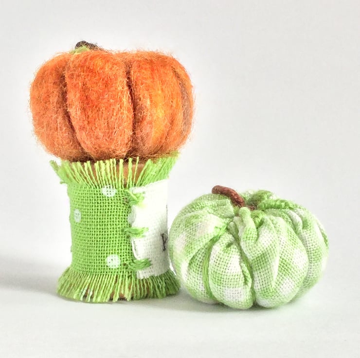 A tiny pumpkin twosome, one has been needle felted and the other made using a teeny piece of ginghm fabric. Both pumpkins have been embroidered to pick out certain details using cast on stitch and satin stitch. Pumpkins are not just for autumn!