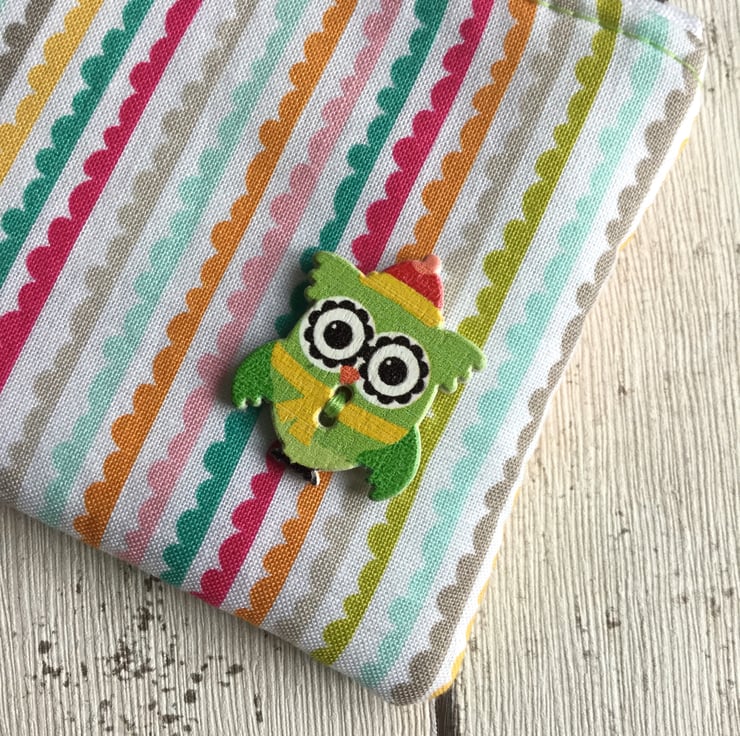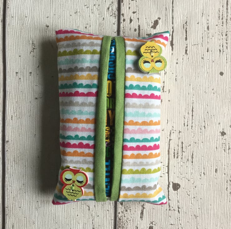 The multi stripped cotton fabric has a white background with orange, pink, turquoise,grey, blue, green and yellow stripes. A mid green plain cotton is used for the lining of both the purse and the tissue holder. The purse has a white zip with green top stitching and a novelty owl button on either side. The tissue holder has two novelty owl buttons.