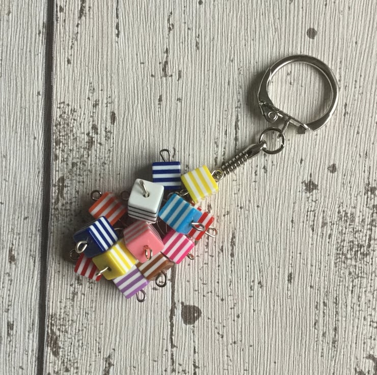 The handmade keyring or bag charm consists of 14 stripy coloured square beads attached to a length of chain and complete this set.