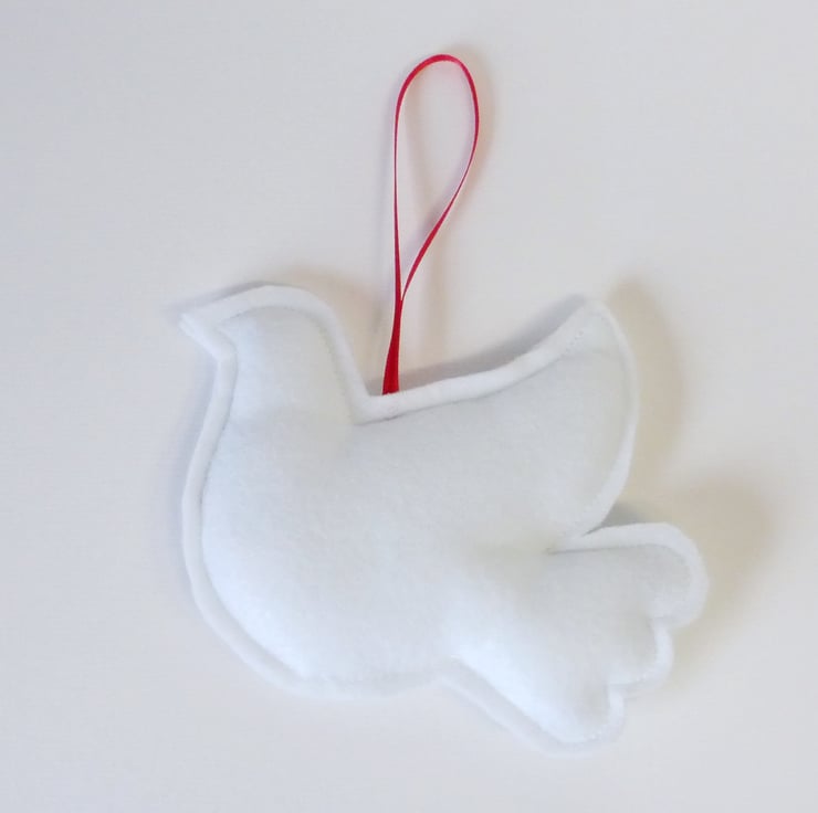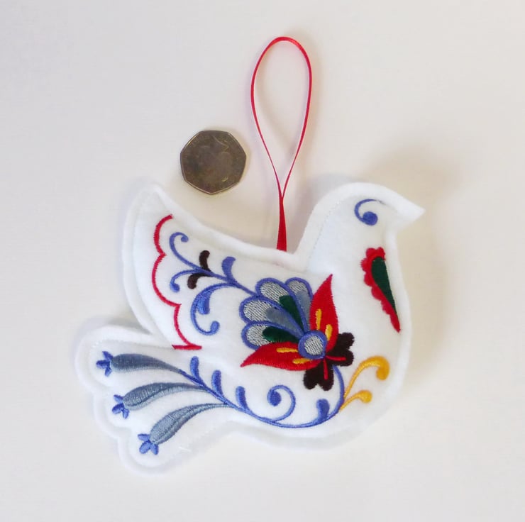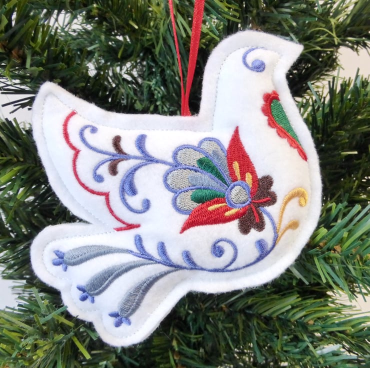 It measures approximately 4.5" (11.5 cm) tall and 5.5" (14 cm) wide at the widest point, and hangs from a ribbon which is approximately 4" (10 cm) long.