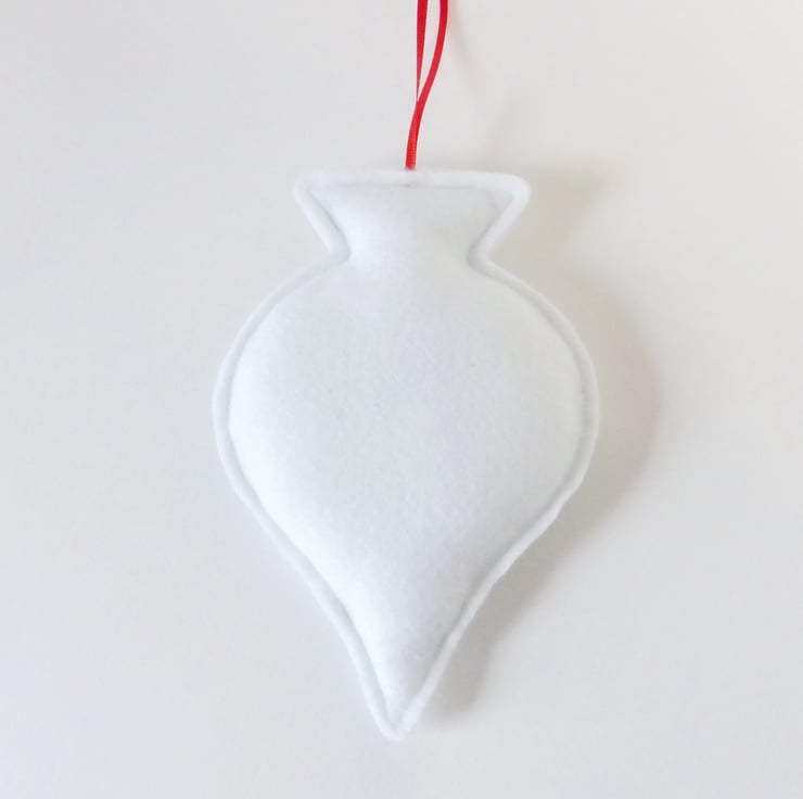 It measures approximately 4.5" (11.5 cm) tall and 7" (13 cm) wide at the widest point. It hangs from a ribbon which is approximately 4" (18 cm) long.