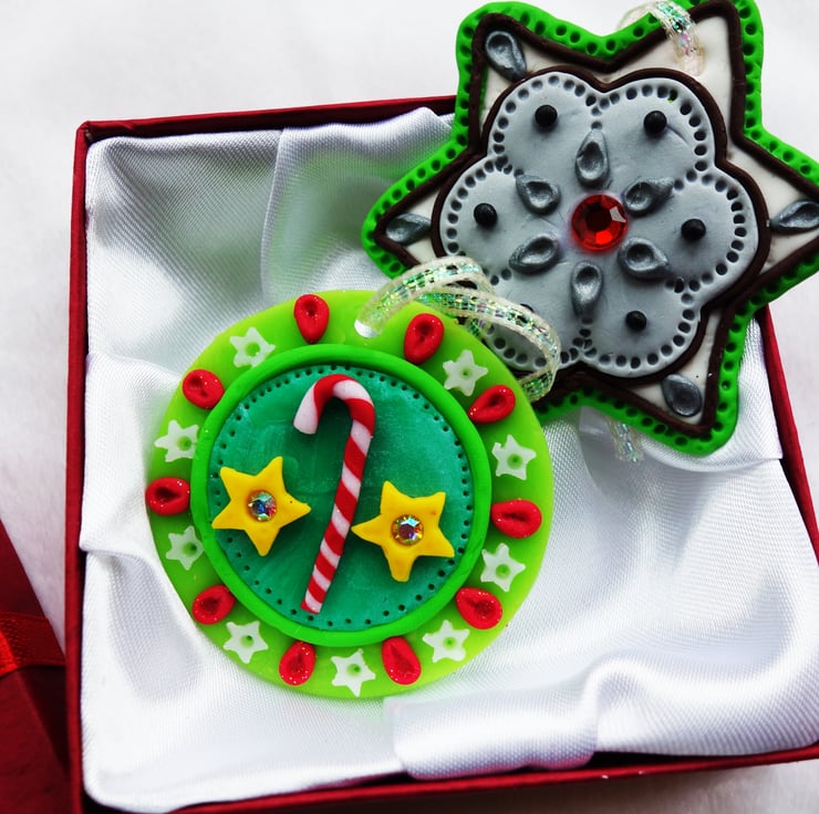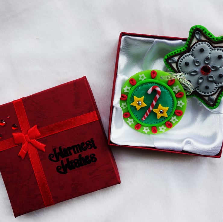 Two delightful polymer clay discs, with diamante inclusions, ready to hang on the Christmas tree or for use as home decor. Handmade and one of a kind. Size approx 2 inches. Boxed in luxury satin lined gift box embossed with greeting message. Great and unique stocking filler.