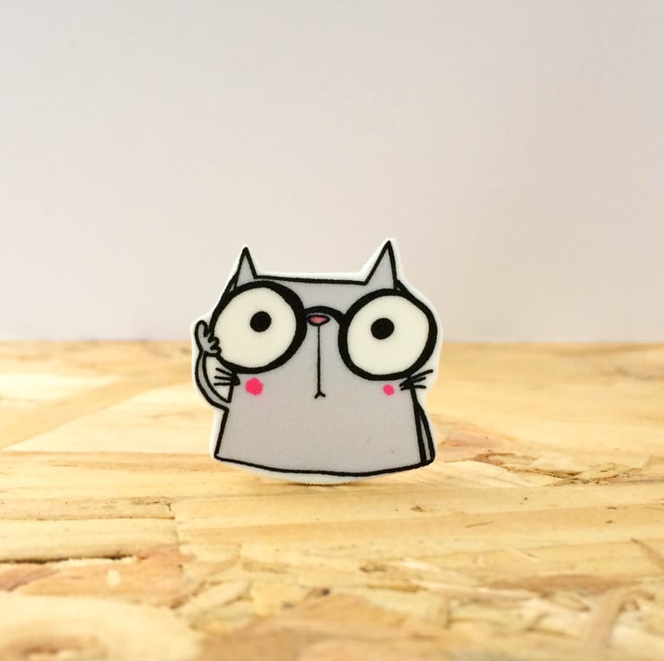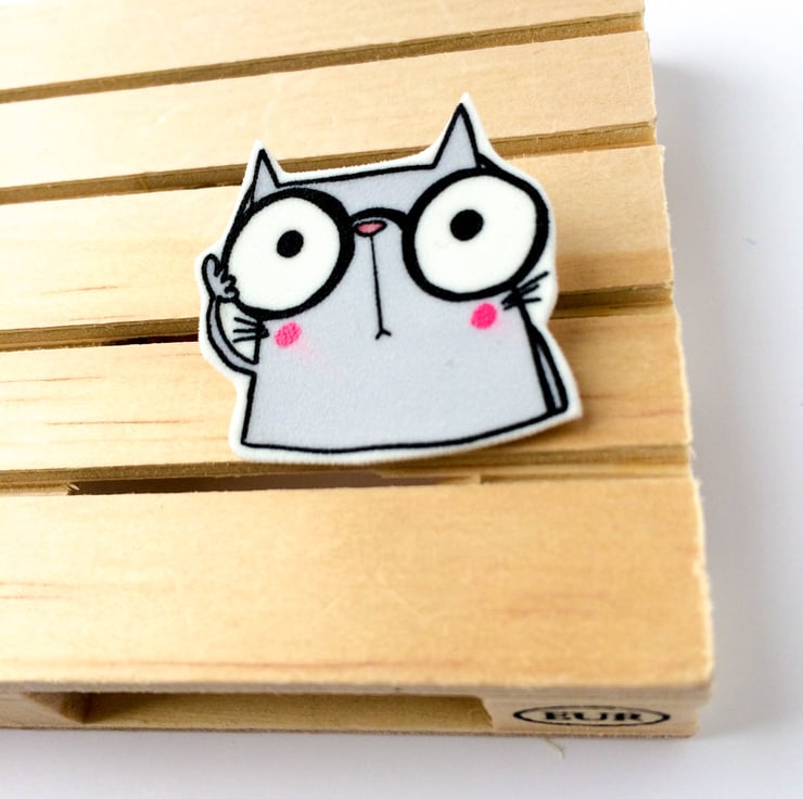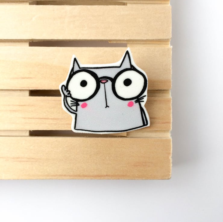 This spectacled kitty sketch is printed to shrink plastic, cut out by hand and then baked in a hot oven to shrink and harden. Once cooled he is given a few coats of clear matt varnish for protection and then he is mounted on a badge pin ready for wear on jumpers, coats and cardigans!
