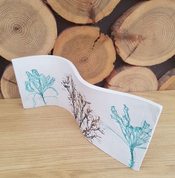 Approx 30cm wide, this curved panel is decorated with impressed real flowers/plants, and glazed in a selection of beautiful natural browns and green glazes.