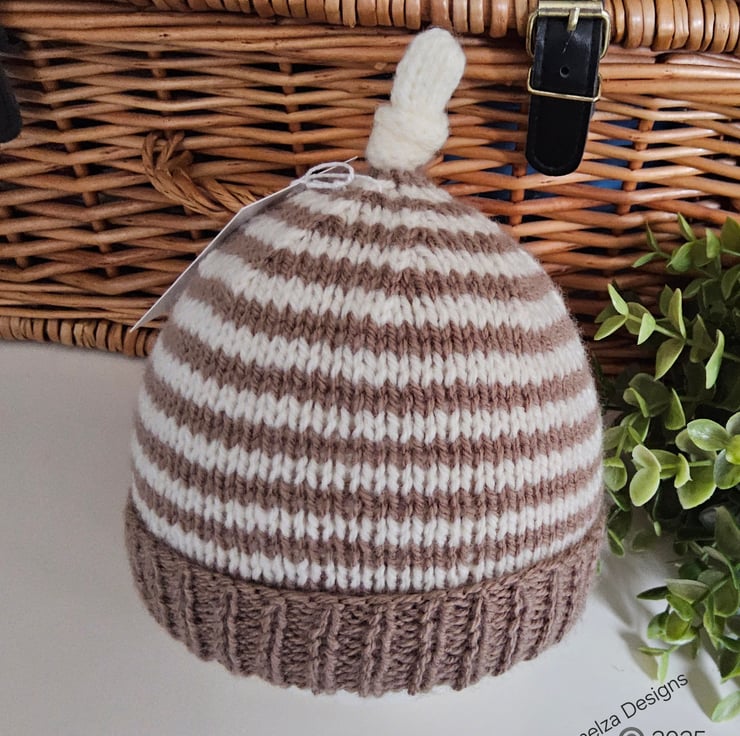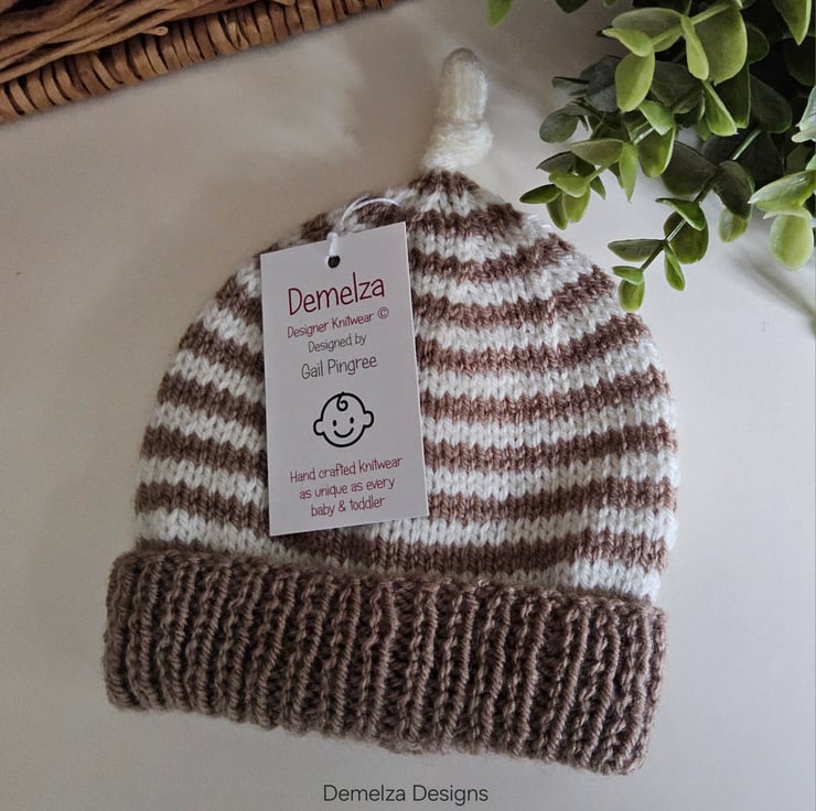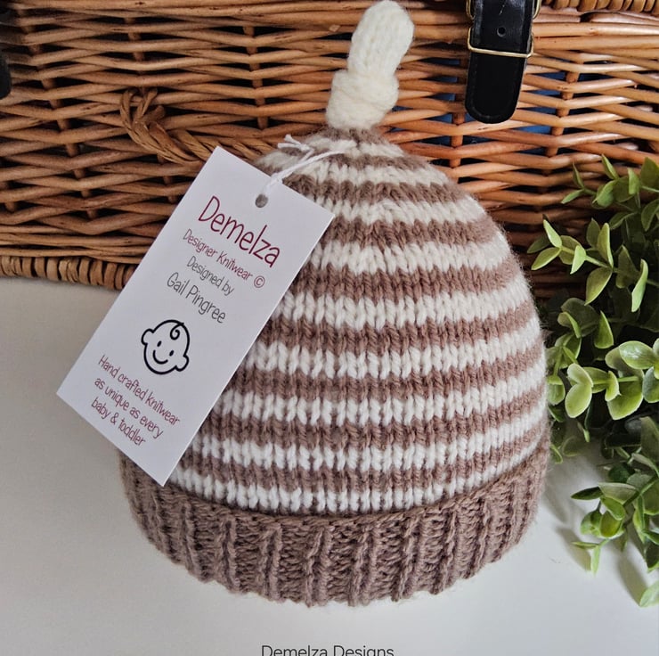 A lovely practical unique baby hat hand knitted and designed in Cornwall. It's ribbed turned up brim will keep a babies delicate ears protected from the wind and the cold whilst ensuring their head is kept cosy and warm. This item would make a perfect token baby shower gift or a gift for a newborn baby.