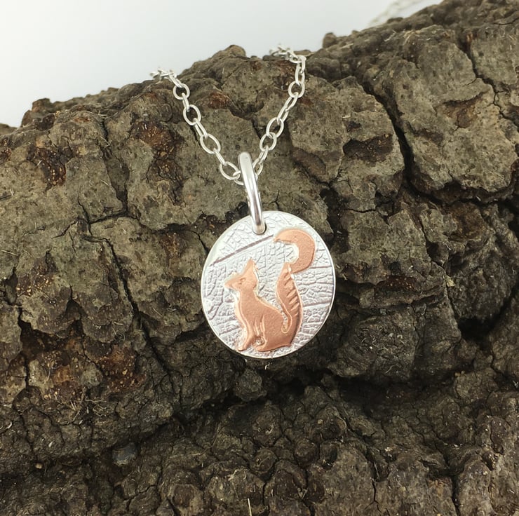A happy copper fox sits peacefully under a copper star. Textured with an imprinted leaf pattern the copper details stand out against the polished sterling silver.
