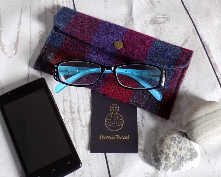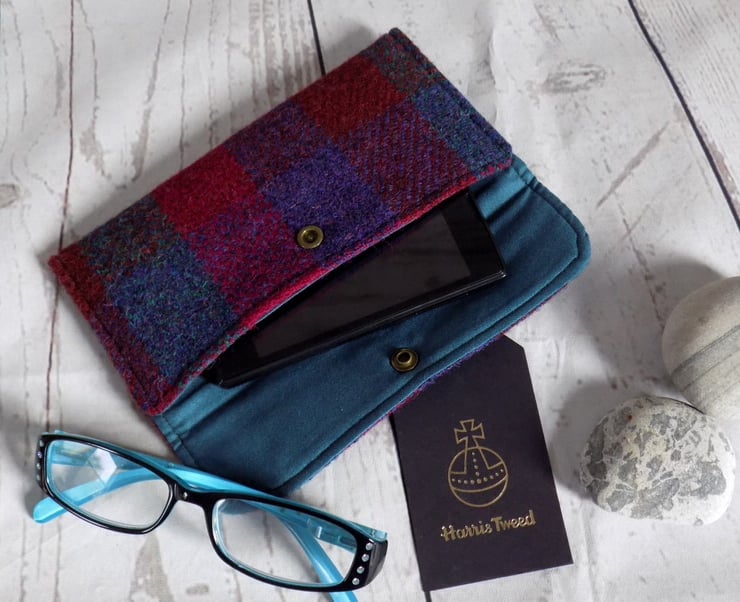 Harris Tweed eyeglasses case/phone pouch/gadget pouch in dark teal, crimson, purple and burgundy check with dark teal lining. This generously sized, padded pouch will protect your glasses or phone from scratches, and is secured with a Kam snap closure. Lined with 100% cotton. The woollen fabric is hard wearing and dirt-resistant and can be spot-cleaned.