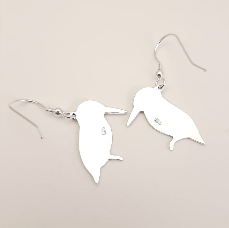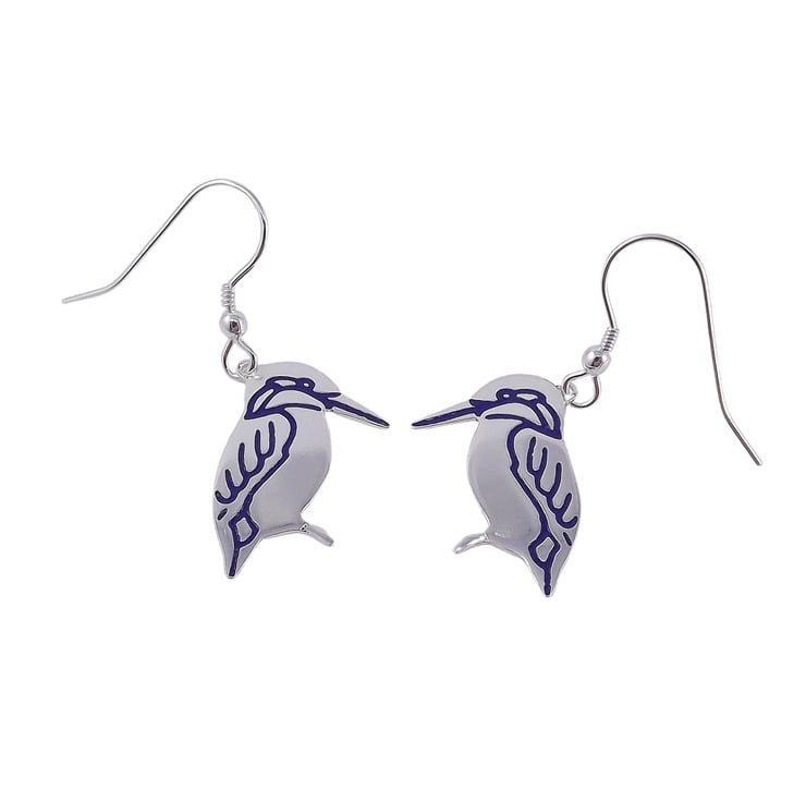 These sterling silver kingfisher drop earrings are from my wildlife themed jewellery range and have been lovingly crafted by hand. They are made from recycled sterling silver and are etched before being cut out with a piercing saw, the edges are then smoothed using files and emery paper before the earrings are carefully given their shape using a punch and hammer. A blue resin based enamel is added to the etched areas and then the piece is then polished before being attached to ear wires.