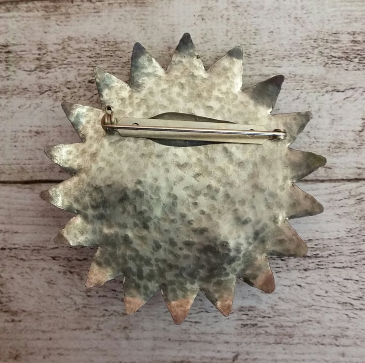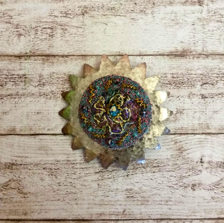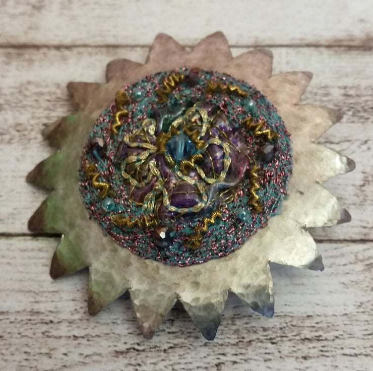 A star made from hammered aluminium and a silk and plastic embroidery piece applied with hand-stitched beads, goldwork and swarovski beads.