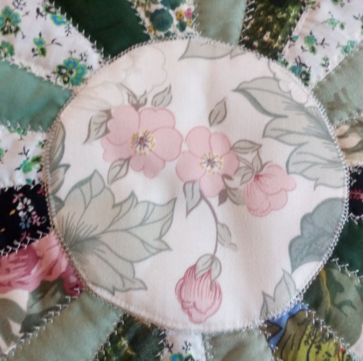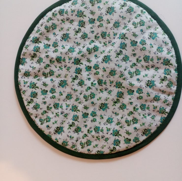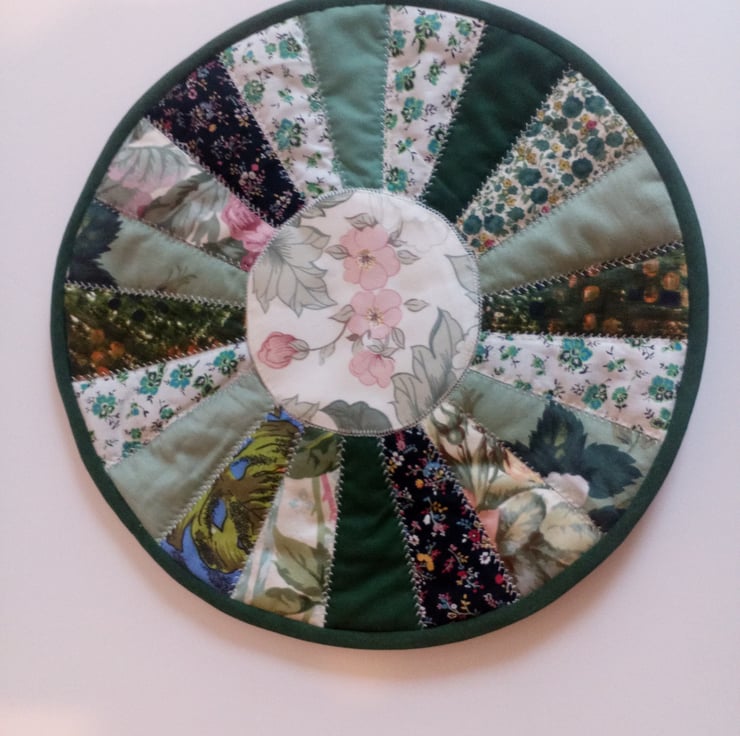 This is a round patchwork & quilted tablemat. It can be used as a placemat or table centrepiece. It measures approx 35cm in diameter. It has a bias binding edging and is in a green theme. It is backed in a green floral design fabric. It is made from a variety of fabrics mostly cottons.