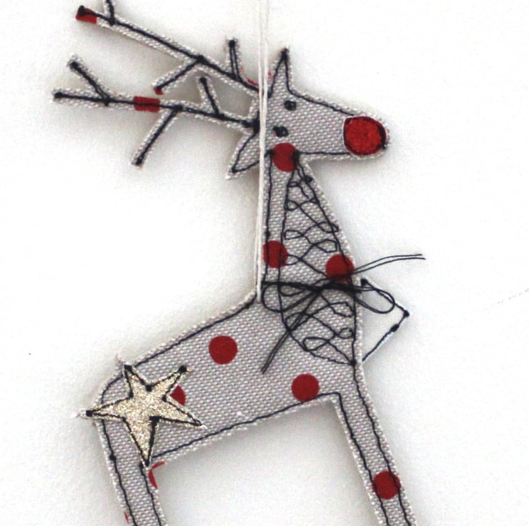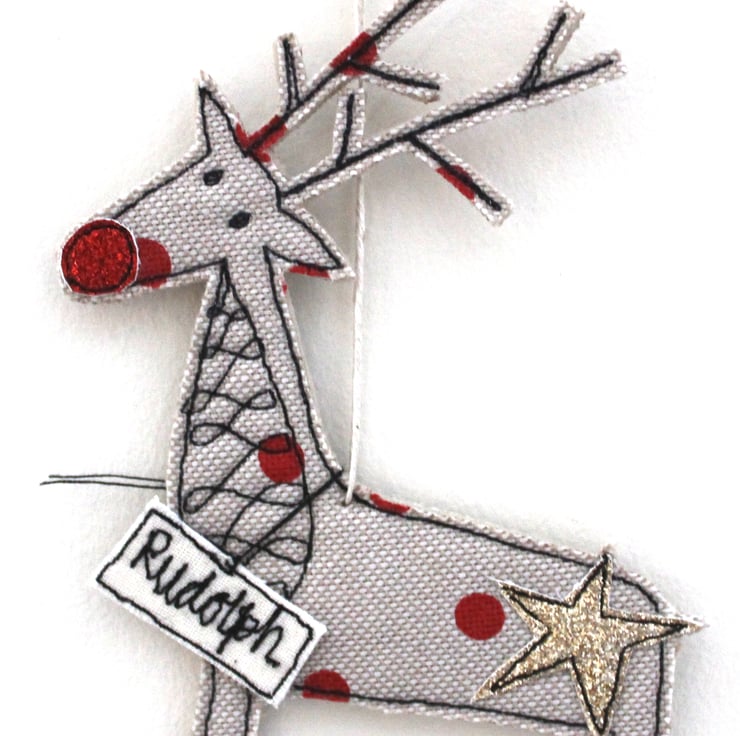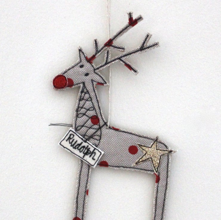Rudolph is created using cotton cloth printed with red spots, glitter cloth and free hand machine embroidery.
