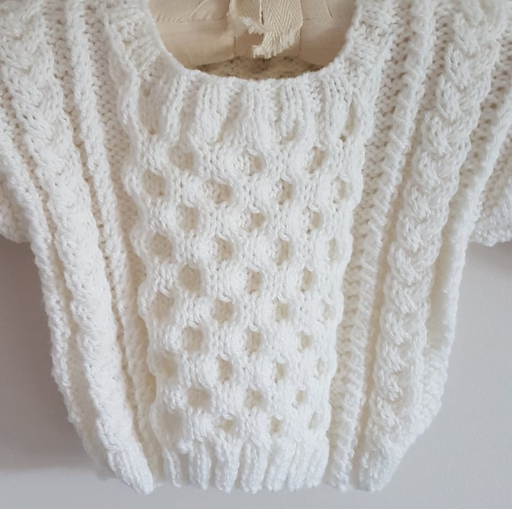 There is a honeycomb pattern in the middle and twisted cables along either side of the back and the front. The honeycomb pattern runs along the sleeves.