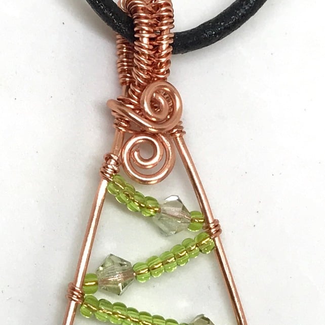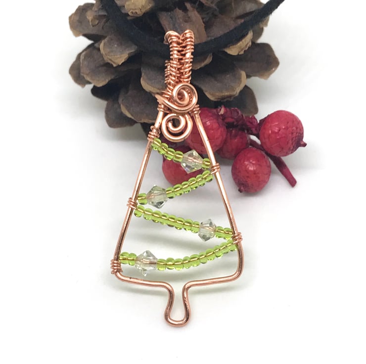 I have formed copper wire into Christmas tree shape and wrapped pretty green Czech crystals and green seed beads around the tree with copper wire.