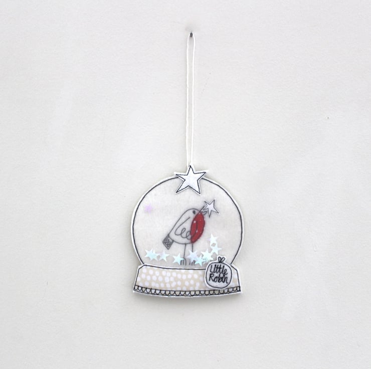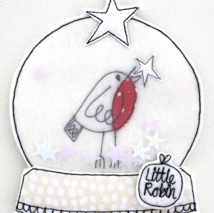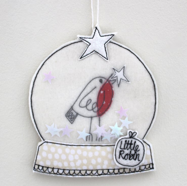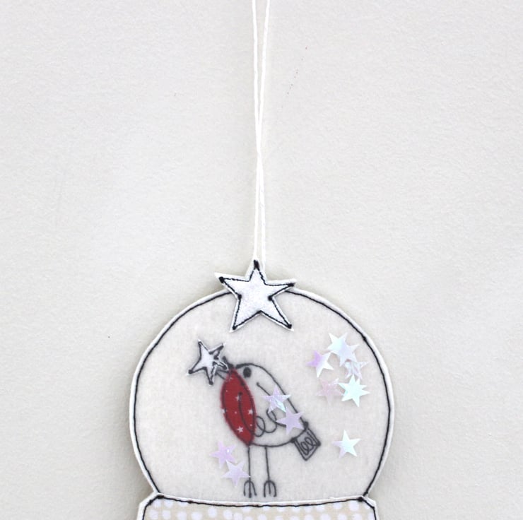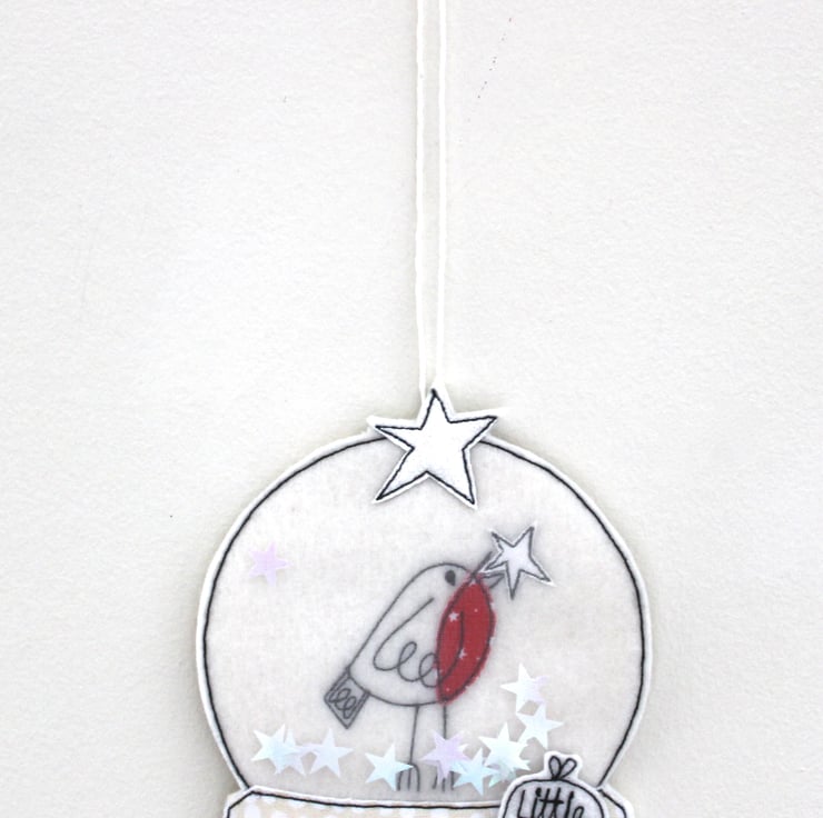 Robin snow globe is created using 100% cream wool felt, silk organza, red printed with stars cotton cloth, glitter cloth, star confetti and free hand machine embroidery. Within the globe are a scattering of little stars which move when the decoration is shaken.