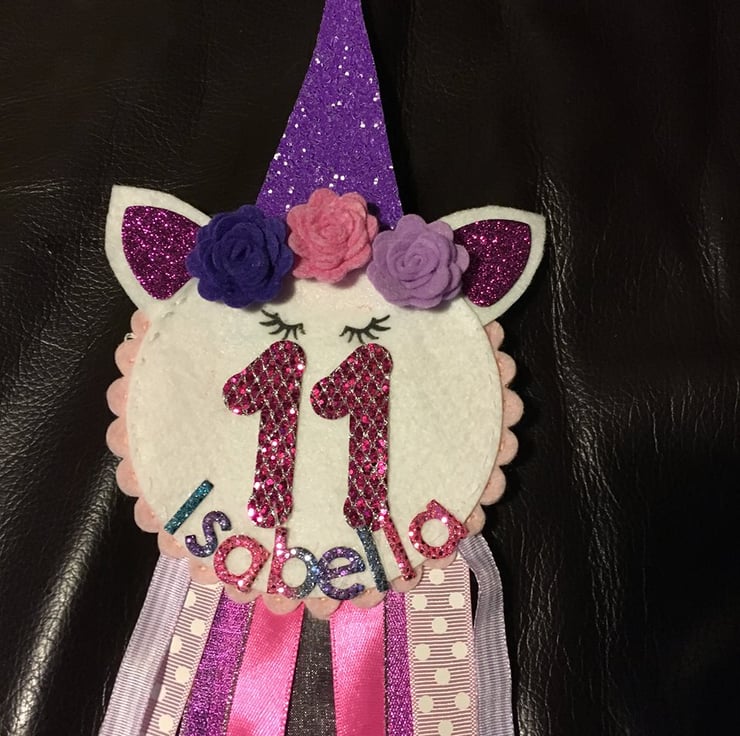 Just what every little girls wants at the moment, a pretty Unicorn Birthday badge made in felt, can be Personalised with any age and name as well if you would like, flowers and number can be made in any colour.