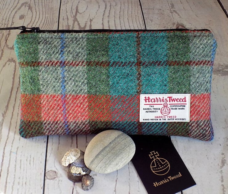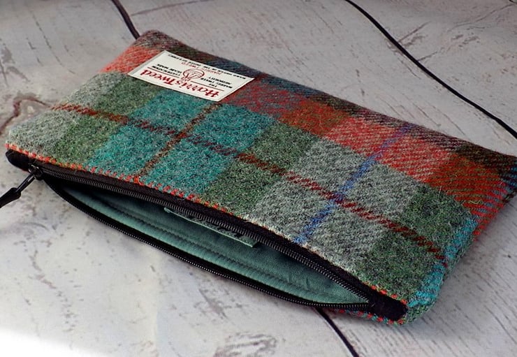 Harris Tweed clutch purse/zipper pouch. Can be used as a makeup bag, a pencil case, or an elegant clutch for a night out. Tartan weave in turquoise, green, burgundy and rust/burnt orange. It is padded, has a black zip with black leather zip pull and teal cotton lining. Alternatively, a wipe-clean water-resistant lining fabric is available in bottle green or black - just send me a message with your order. Equally, if you would prefer a different colour zip or lining, send a message when you order.
