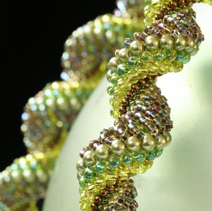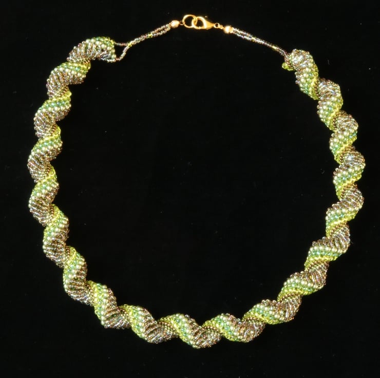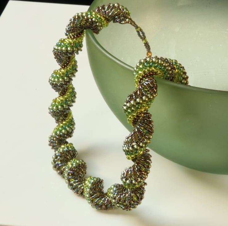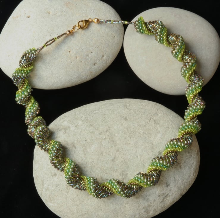 This pretty, richly textured, spiral rope necklace is handwoven using glass seed beads and 3mm pearly beads in shades of green from dark olive to pale sage with a little touch of bronze as an accent. The stitch used in this necklace is called Dutch Spiral. Its hollow structure makes it surprisingly lightweight despite its thickness. But it is also robust as it is stitched using Fireline braided beading thread. It is finished with pretty sea-shell shaped calottes and a gold plated trigger clasp.