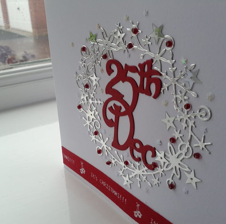 A completely handmade and uniquely designed pack of 4 cards. Two colourways of same design. Consisting of a frosty wreath die cut from silver mirri card. With 25th December die cut in the centre. Mounted onto quality pristine white card. The wreath has been embellished with co-ordinating beads, silver stars and tiny holographic stars. Finished off with it's Christmas ribbon