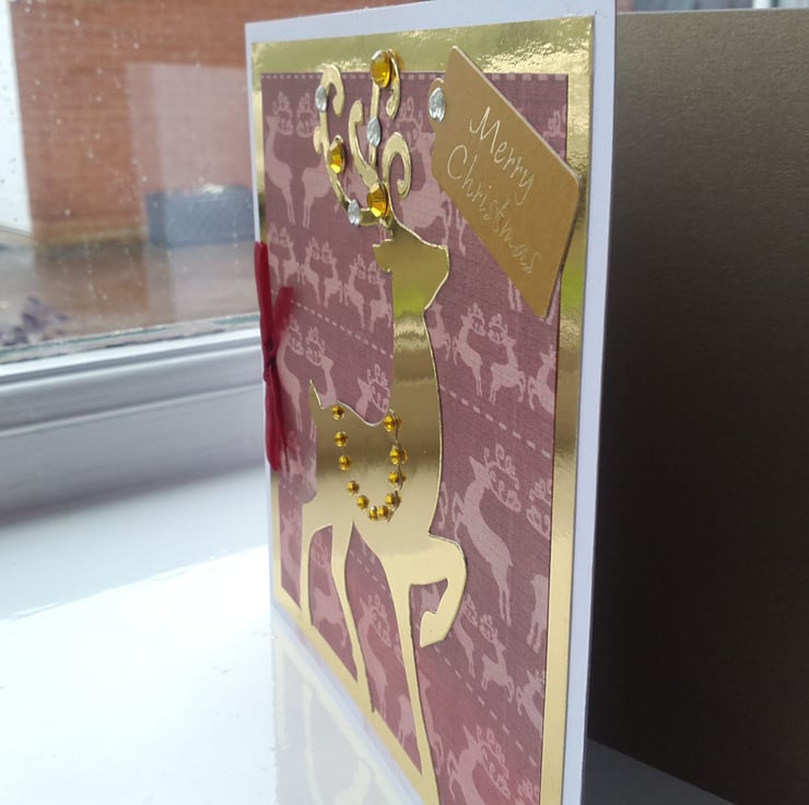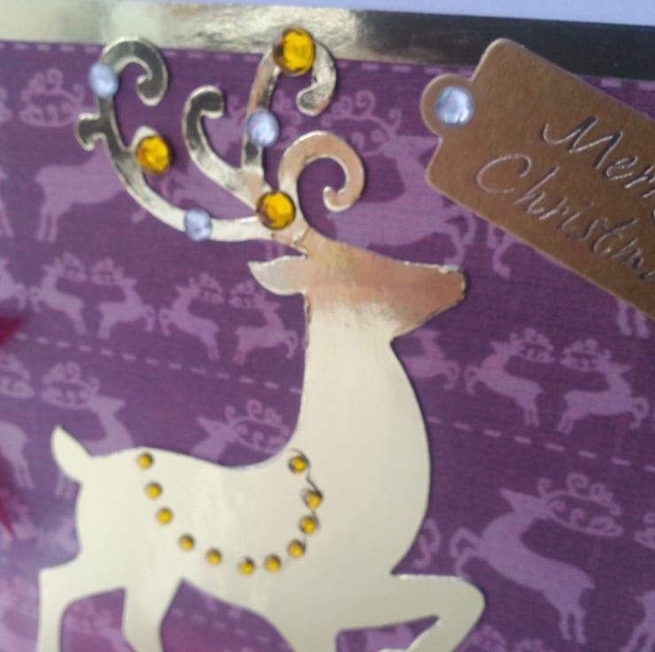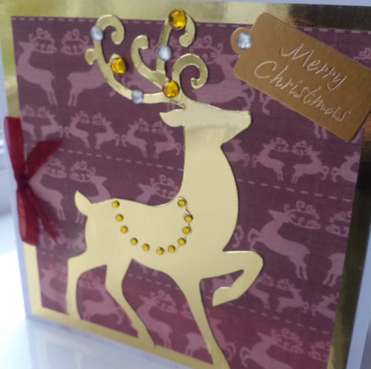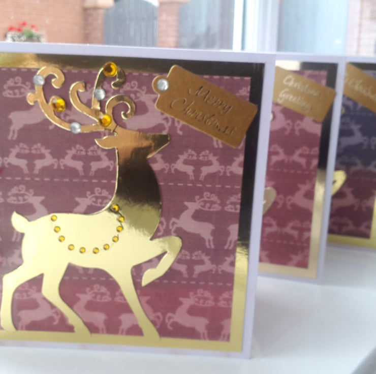 A completely handmade and uniquely designed pack of 4 same design cards. Consisting of a handsome stag die cut from go!d mirri card, mounted onto stag patterned paper, then onto gold mirri card and finally onto pristine white quality card. Embellished!listed with gold and silver pearl rhinestones. A festive tag and finished off with a dark red organza bow.
