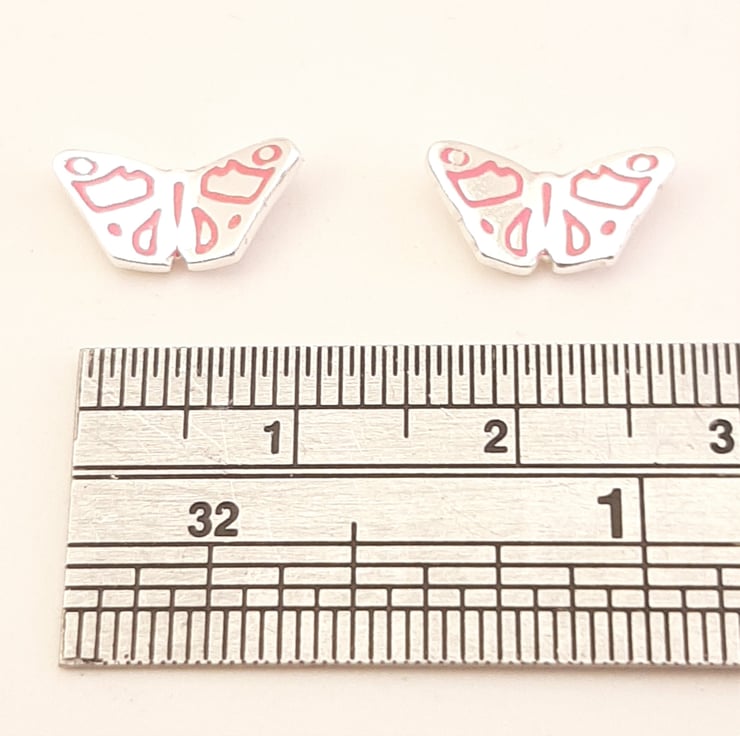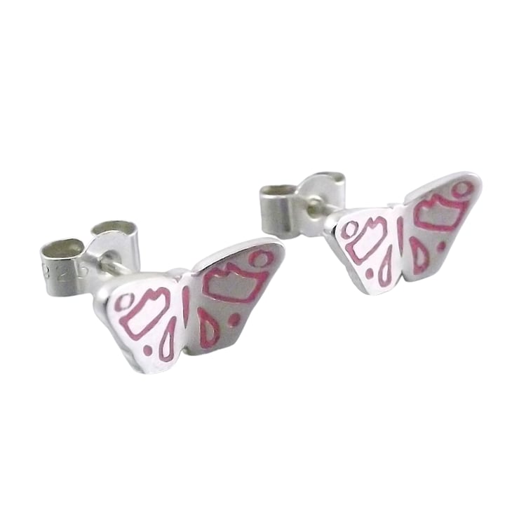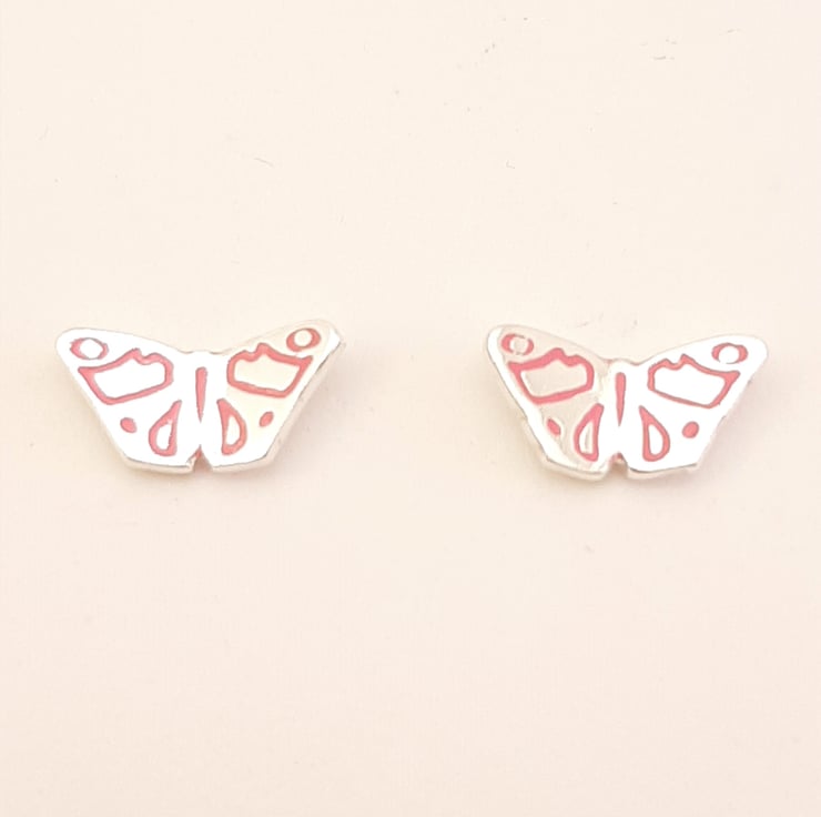 These butterfly stud earrings have been lovingly crafted from recycled sterling silver sheet and are etched before being cut out with a piercing saw, the edges are then smoothed using files and emery paper before the earrings are carefully given their shape using parallel pliers. 11mm ear pins are then soldered onto the back. A coloured resin based enamel is added to the etched areas and then they are polished.