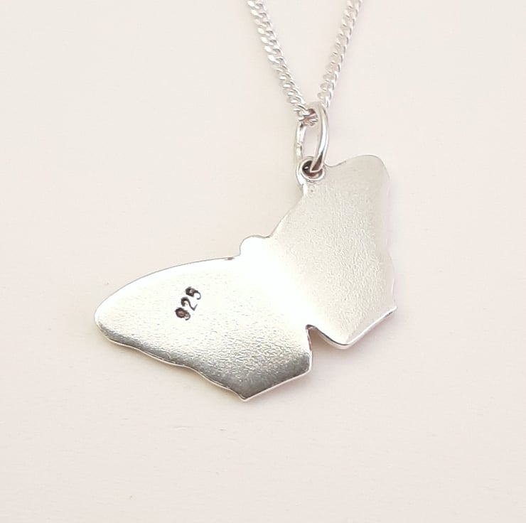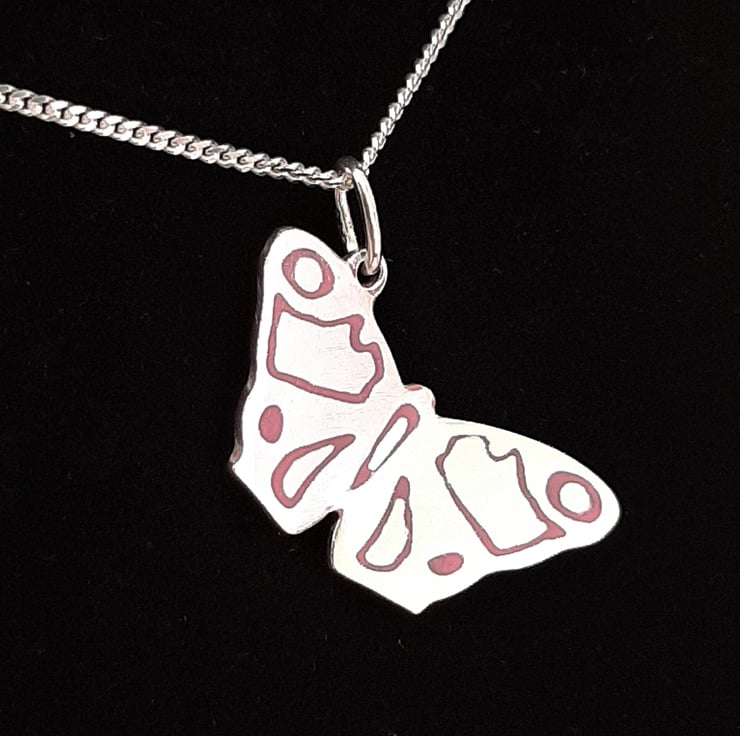 This silver butterfly pendant is from my wildlife themed jewellery range, it's made from recycled sterling silver sheet and has been etched before being cut by hand, the edges are then smoothed using files and emery paper before it's carefully given their shape using parallel pliers. A 5mm oval jump ring is then attached. A coloured resin based enamel is added to the etched areas and then the piece is polished before being attached to a chain.