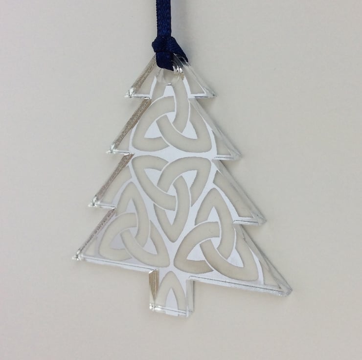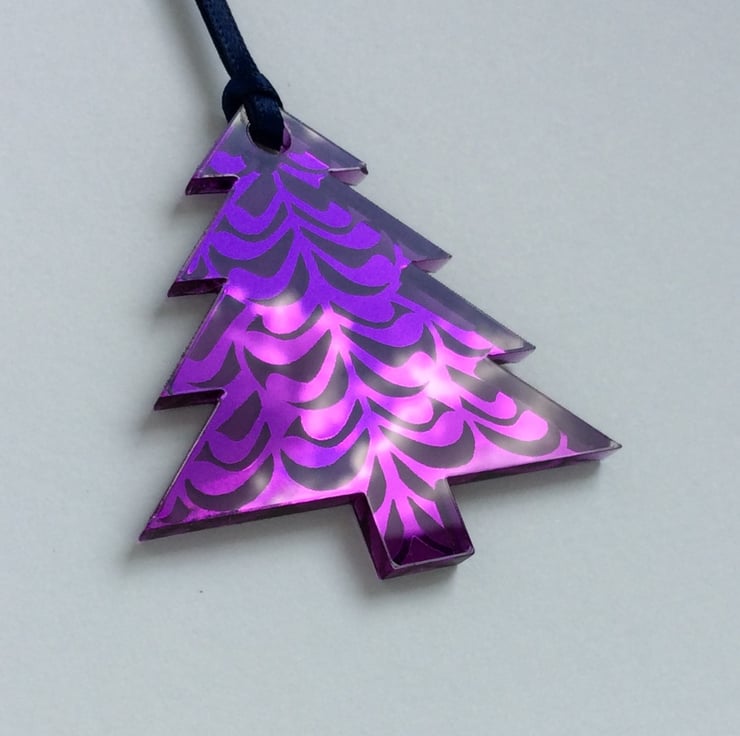 A sparkly laser-etched tree-shaped decoration. The design is based on an original set of doodles in my sketchbook and is reverse-etched into the mirrored acrylic so that it catches the light and reflects the colours and lights around it.