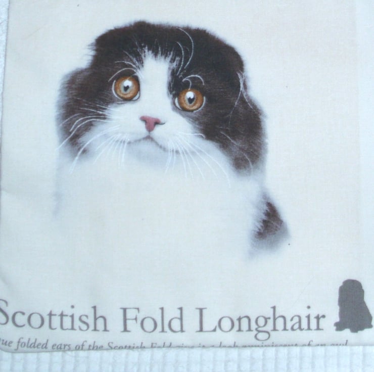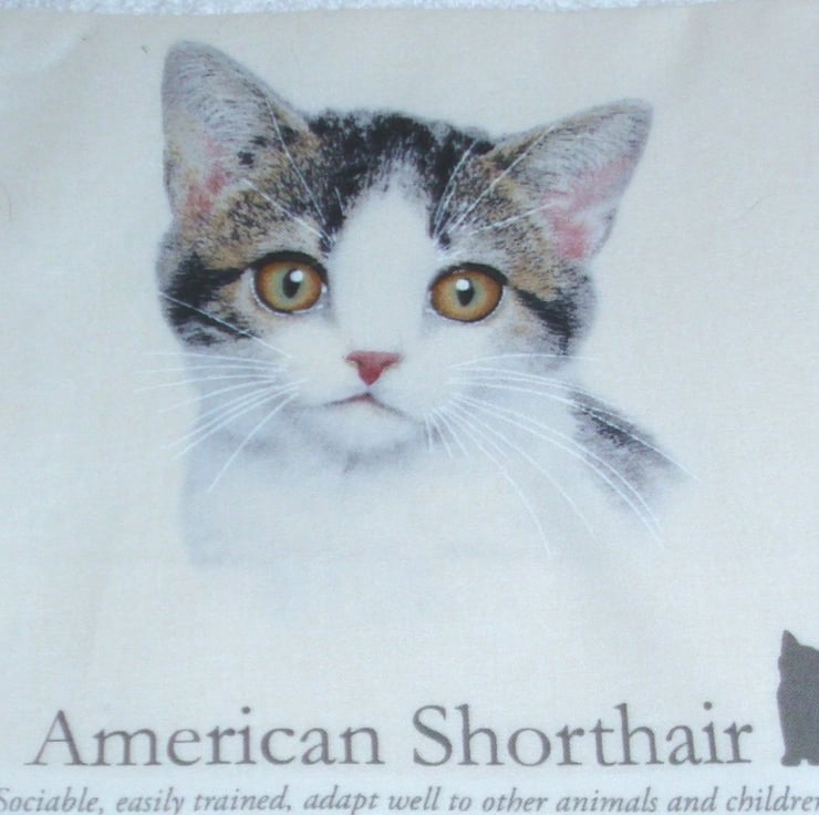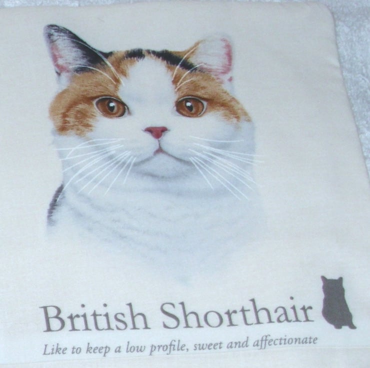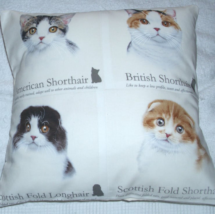 Cats portraits cushion with a British Shorthair, American Shorthair, Scottish Fold Shorthair and Scottish Fold longhair cats in squares with brief descriptions under each one.