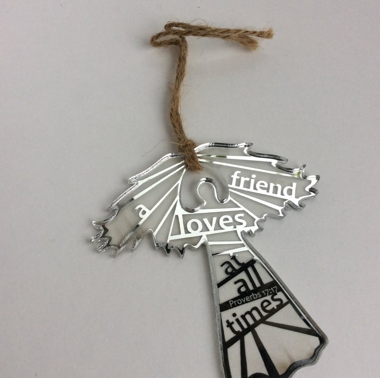The text is laser-etched into 3mm mirrored acrylic and cut to form an angel hanging decoration. Finished with a length of jute twine the angel comes packaged in a 10 x 10cm cellophane bag with card backing.