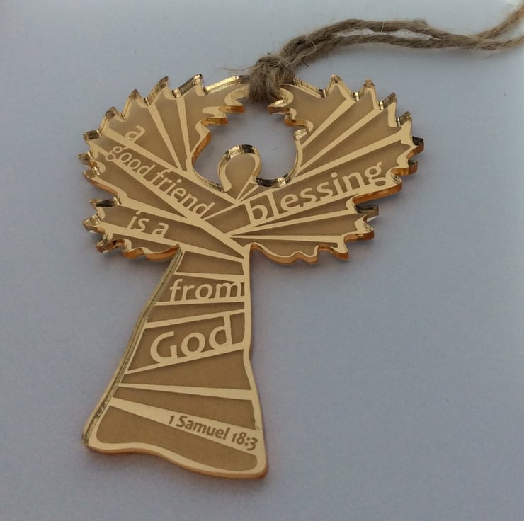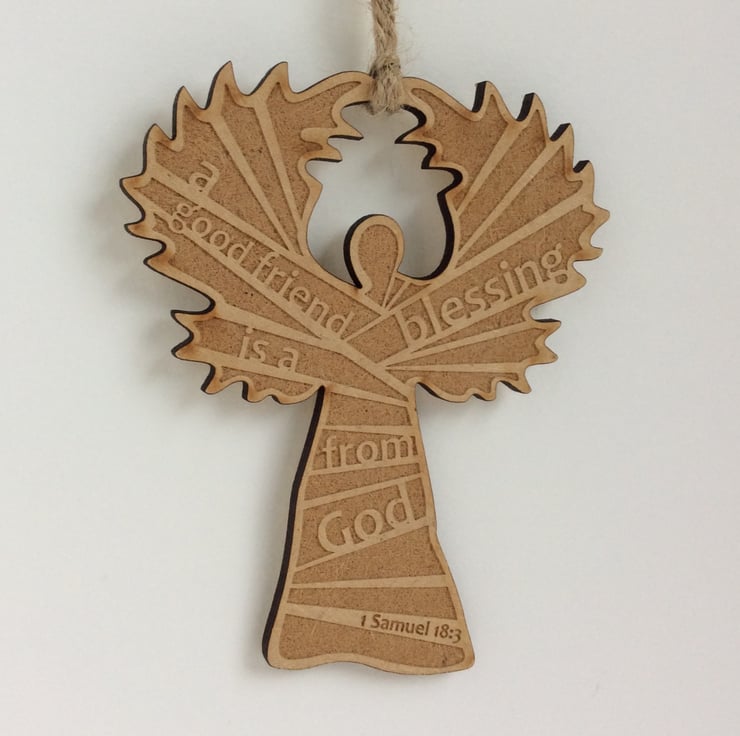 The text is laser-etched into 3mm MDF and cut to form an angel hanging decoration. Finished with a length of jute twine the angel comes packaged in a 10 x 10cm cellophane bag with card backing.