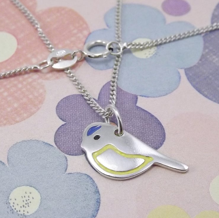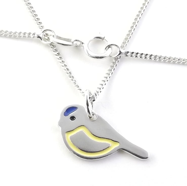This silver blue tit pendant has been lovingly crafted by hand. It is made from recycled sterling silver and is etched before being cut out with a piercing saw, the edges are then smoothed using files and emery paper before it's carefully given its shape using a punch and hammer. A 5mm oval jump ring is then attached. Black, blue and yellow resin based enamels are added to the etched areas and the piece is then polished before being attached to a chain.