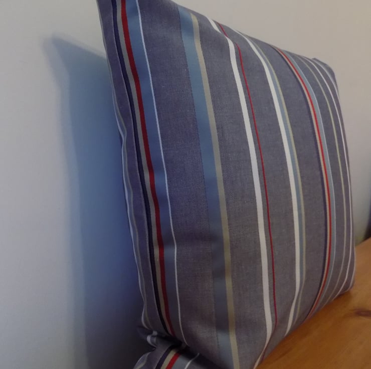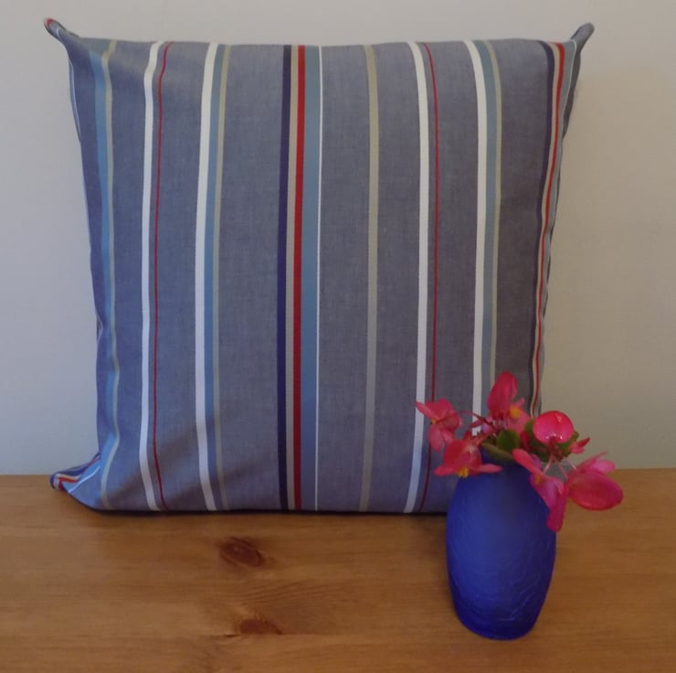This attractive cushion cover is handmade from a 100% cotton fabric comprising blue, red, white and beige stripes on a denim blue coloured background. The stripes are woven into the fabric to give a smart and stylish effect.