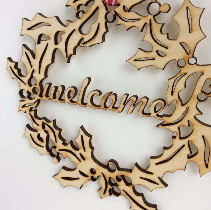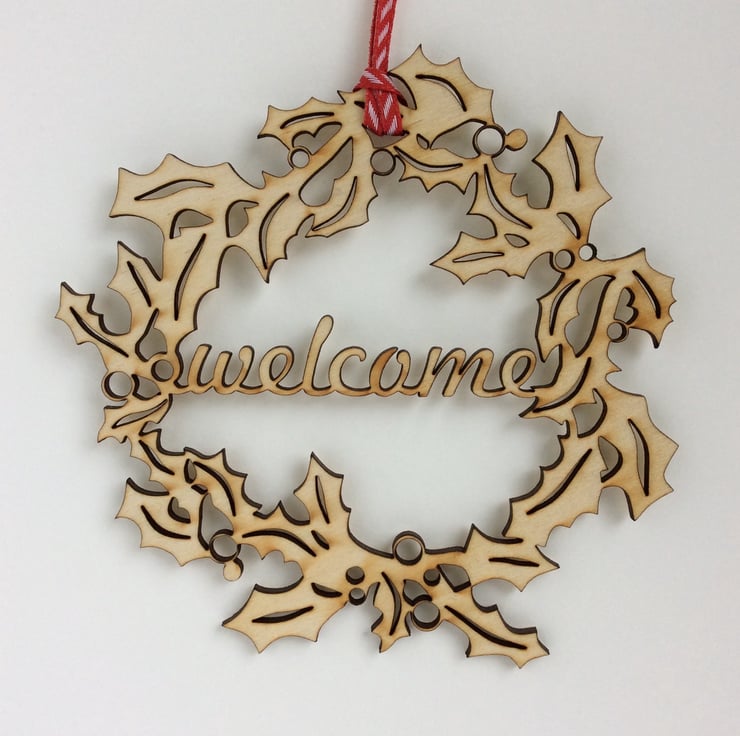 An original design incorporating the words 'Welcome'. This decoration is cut into 3mm plywood and finished with a red and white candy-striped ribbon.
