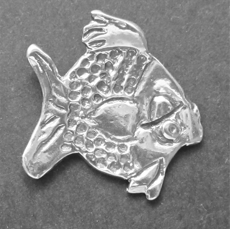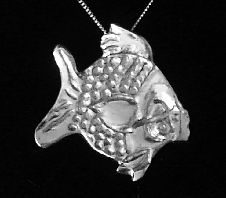 Freddie was designed and made by me, from fine silver clay and the result is a pendant made of 99.9% pure fine silver. He measures 3.3cms high, 3.0cms wide and has a 16inch sterling silver chain.