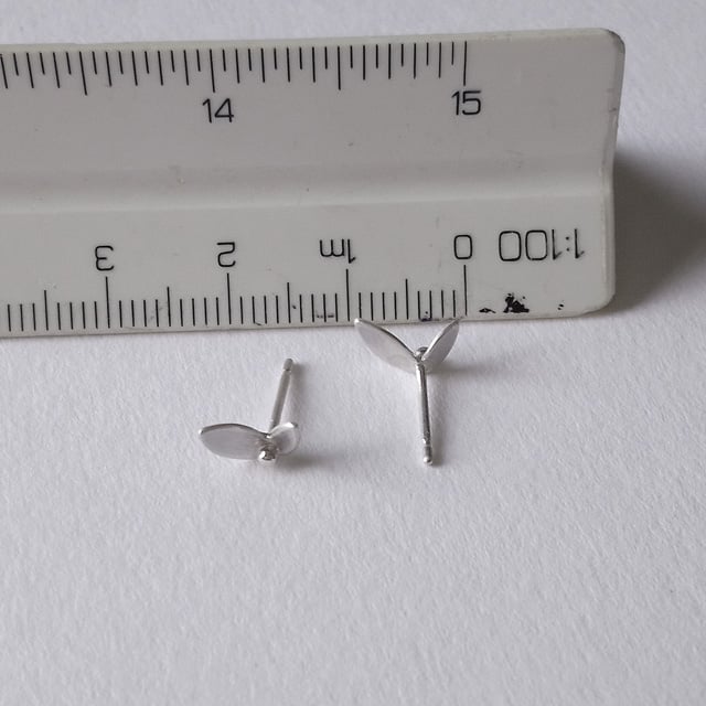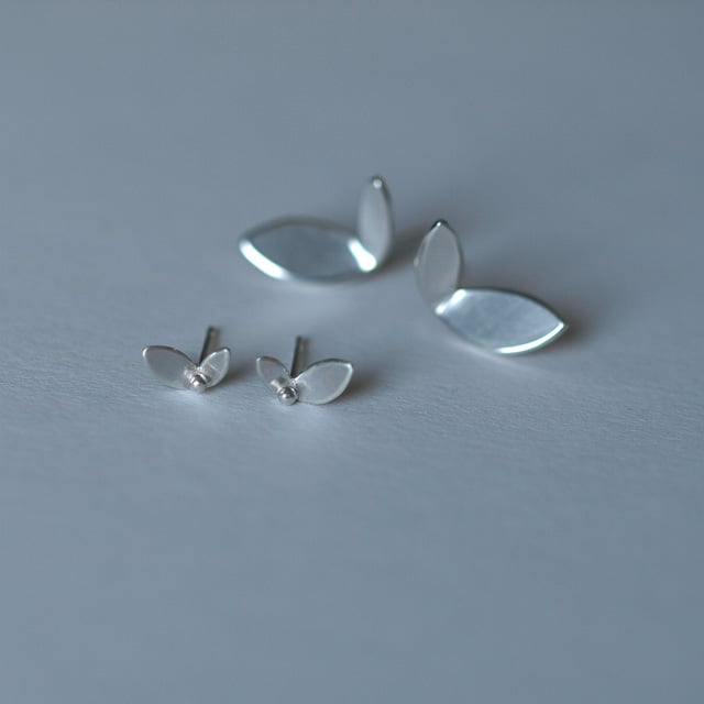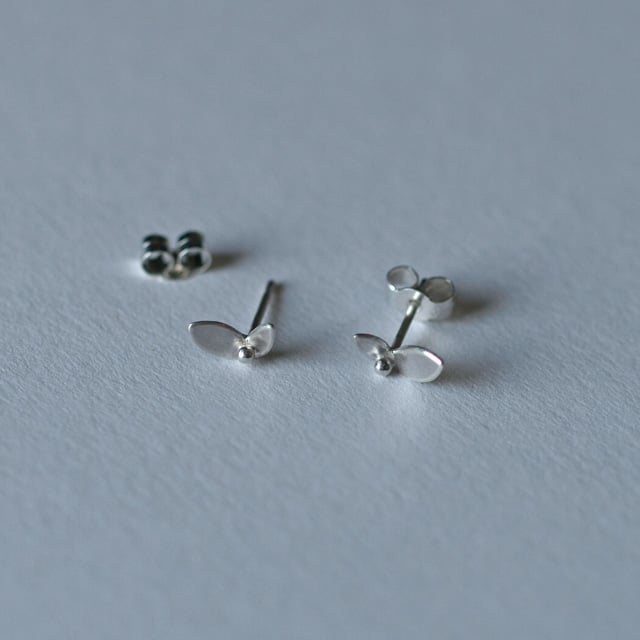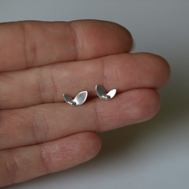These tiny stud earrings have been handmade in recycled sterling silver. The leaf shapes have been hand-sawn from a sheet of recycled sterling silver and then folded slightly between the leaves to create a sense of movement. Between the leaves a small ball has been soldered. The leaves are finished with a matt surface and the balls have been polished to a high shine.