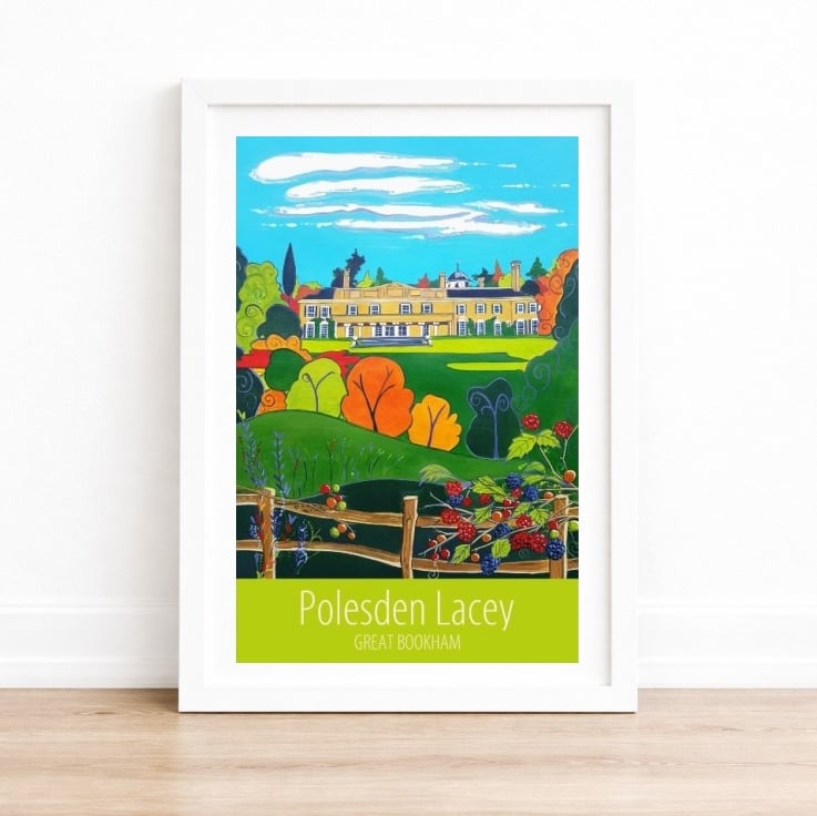 A contemporary travel poster style print of the view across the estate to the National Trust -owned Polesden Lacey house, in Great Bookham, Surrey, (a favourite place of mine!) from my own original acrylic painting. A perfect gift for those who love visiting Polesden Lacey!