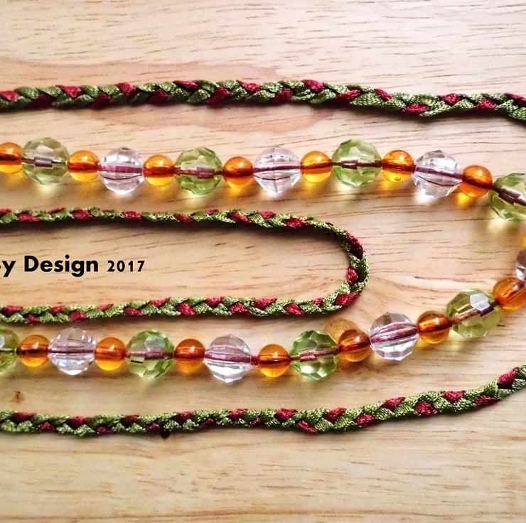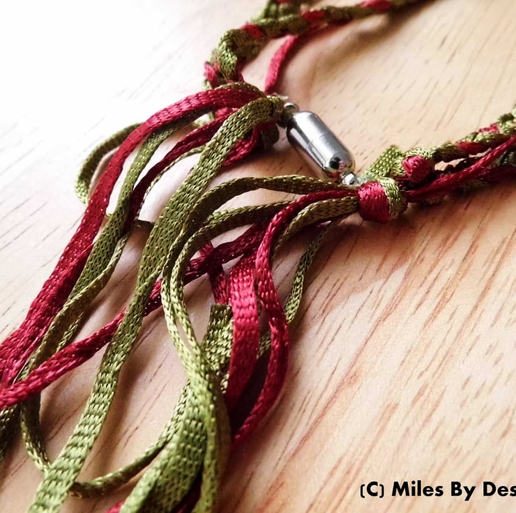 It has been handmade by plaiting together sage green & burgundy ribbons, making two different length strands.