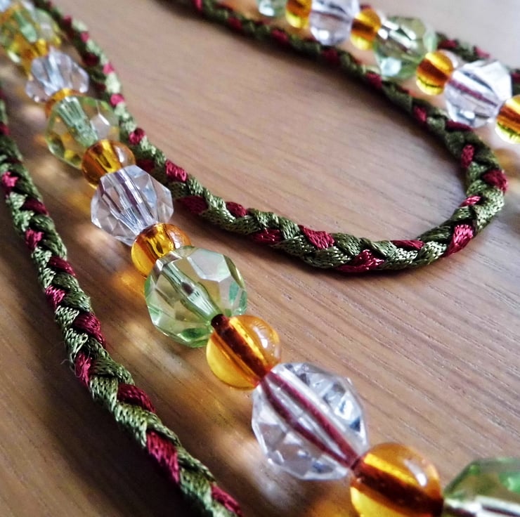 The middle strand consists of pale green, amber and clear coloured plastic beads.