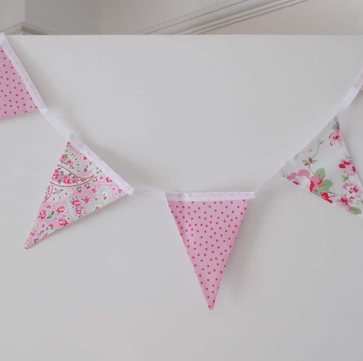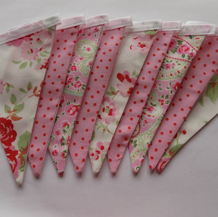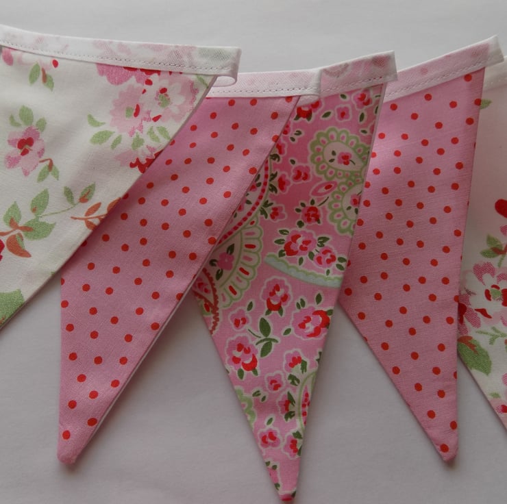 This pretty cotton floral bunting is made from 100% cotton Cath Kidston ‘Rosali’ White Floral Fabric, Red Spots on Pink and Pink ‘Rosali’ Paisley Fabric.