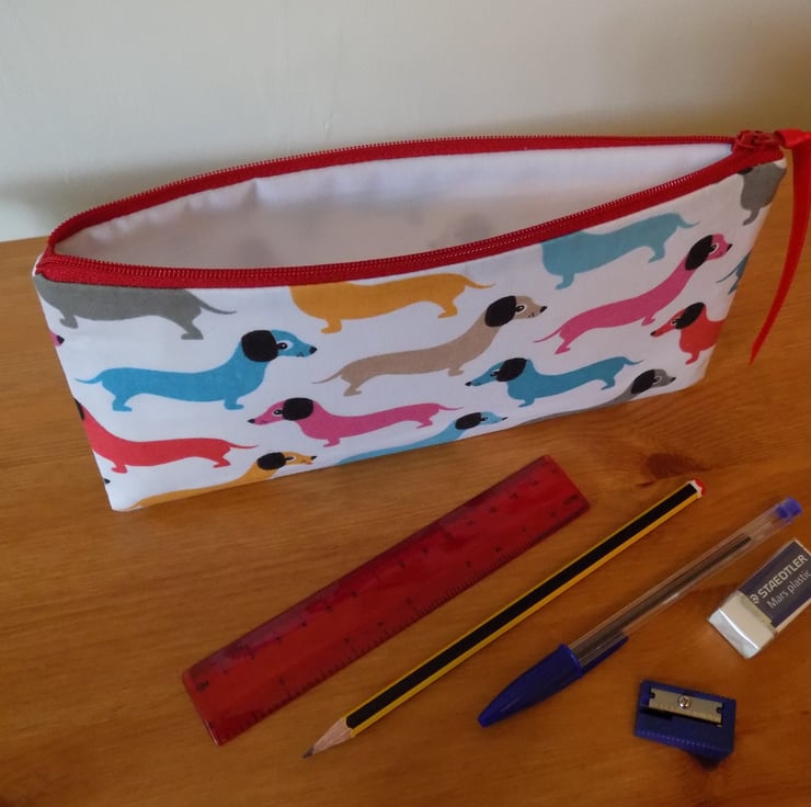 It is handmade with a colourful polyester cotton sausage dog fabric and lined with a co-ordinating white polyester cotton fabric. It is also strengthened with interfacing to give it structure and rigidity.