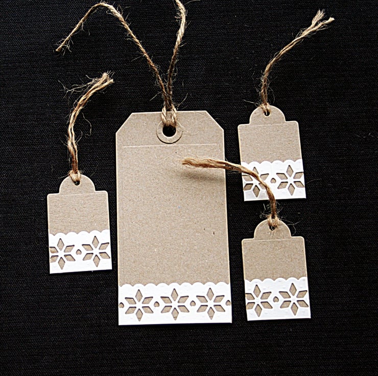 These handcrafted Christmas gift tags are cut from 300gsm brown kraft card which has a simple cream snowflake design border on the bottom edge. Finished with brown twine string.