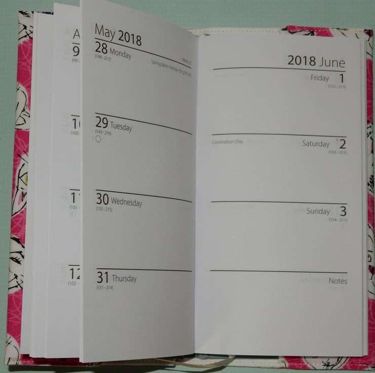 This is one for the cat lovers, a fabric covered week to view slim-line diary (approx. 6.5 x 3.5 inches). It is covered in a cute, quirky cat print fabric. Complete with 2018 week to view diary, refills are easily available, for the next year. The cover is lined, interfaced and removable.