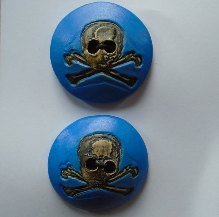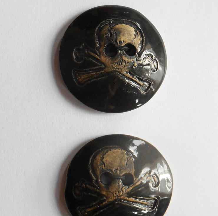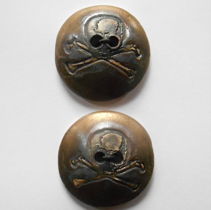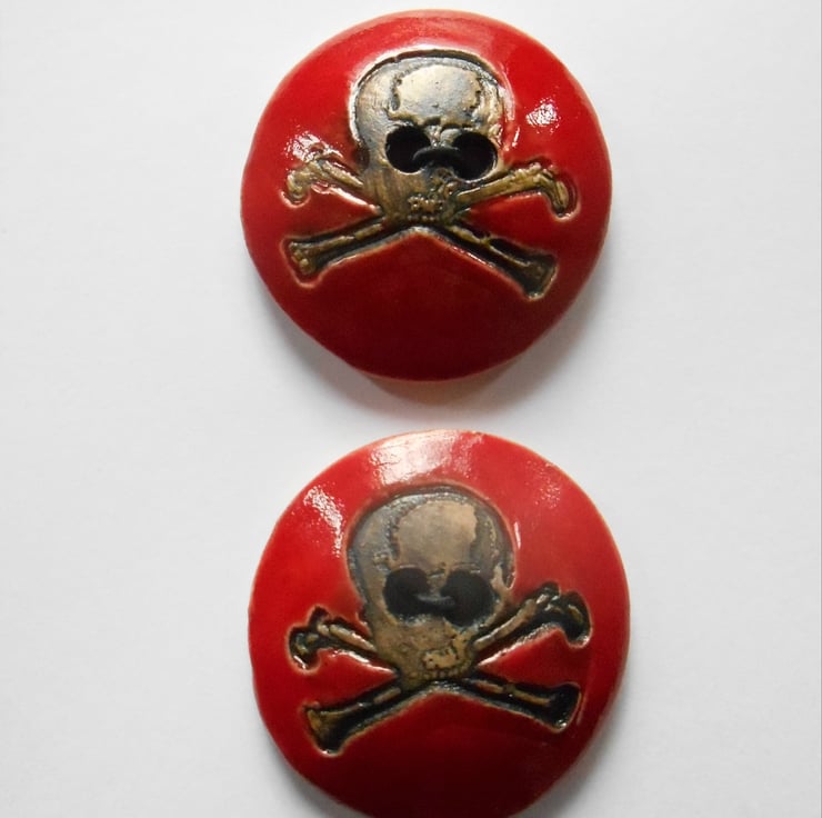 These are durable hand made and glazed Stoneware Ceramic Skull Buttons. Available in :