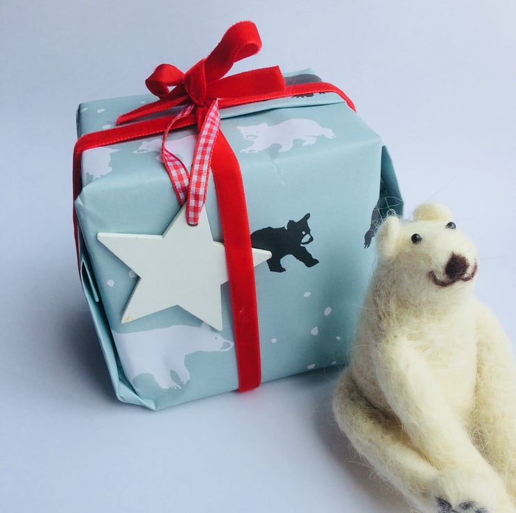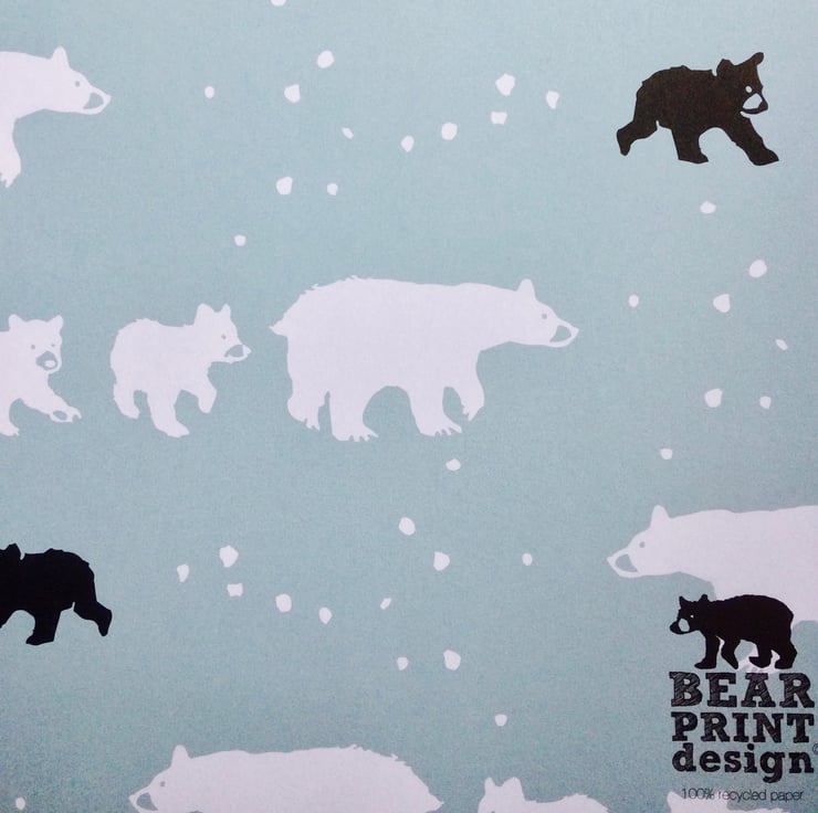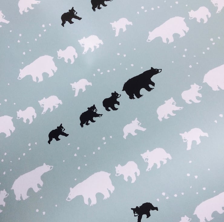 I'm very proud to present (sorry) my first wrapping paper design! Taken from an original linocut called 'Follow The Leader', it features Mother Bear trailing along her brood of three cubs through the winter snow. I have repeated the bears in black and white in the design so there's polar bear families too, especially for Christmas. Printed on a soft duck egg blue colour background on 100% recycled FSC certified 100gsm paper, each sheet measures 50cm x 70cm and will be sent neatly folded.