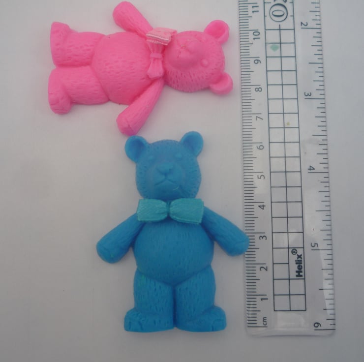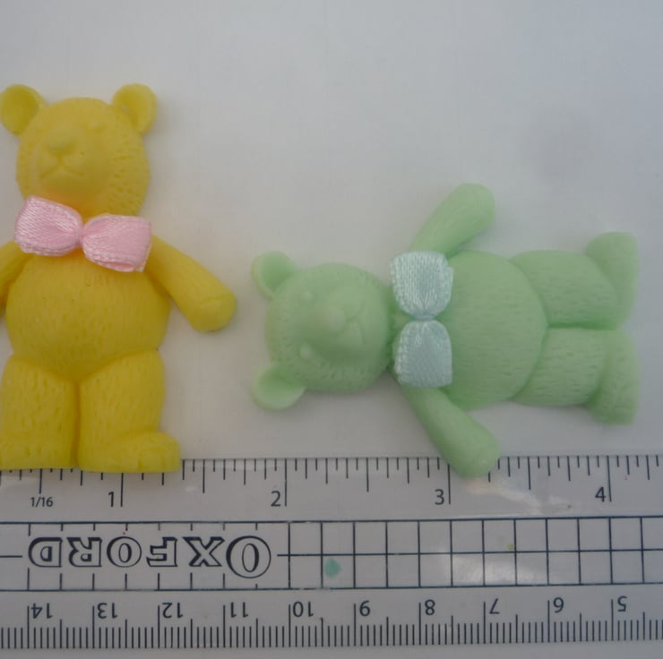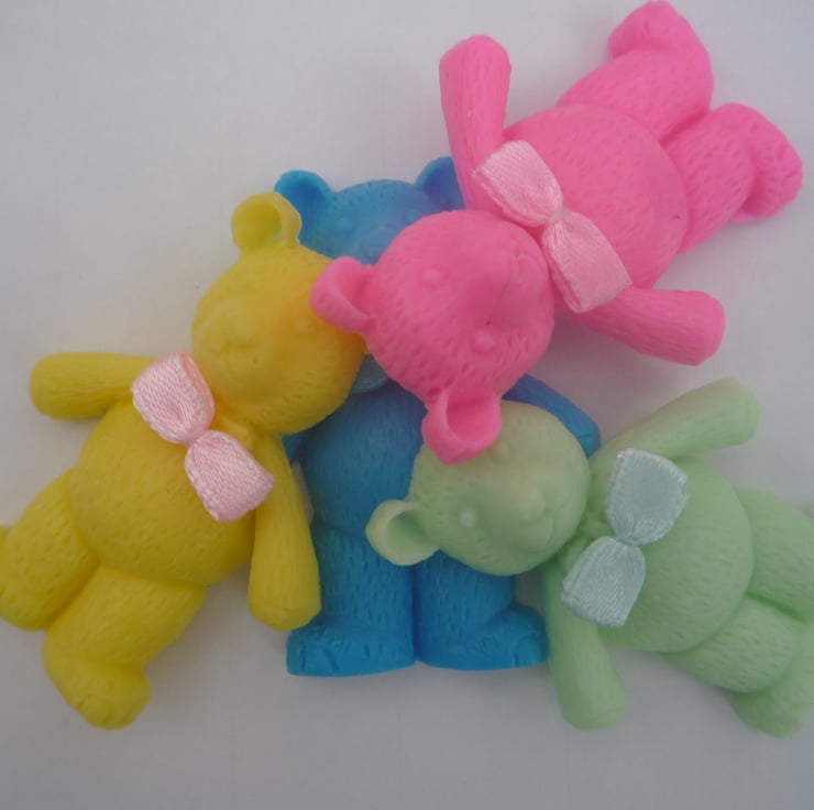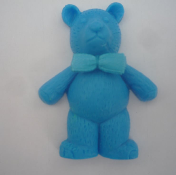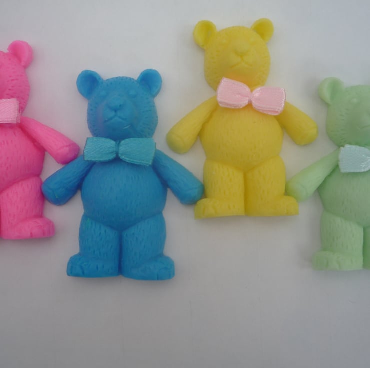 delightful teddy bear shaped novelty soaps, made with goatsmilk, in assorted colours and fragrances. with a removable fabric bow, picked at random. children will love them.