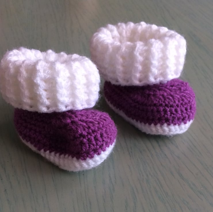 A cute pair of crocheted baby booties, deep purple with white sole and ribbed cuff.