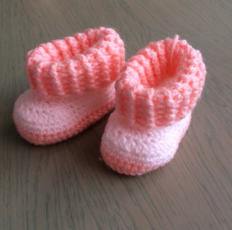 A cute pair of crocheted baby booties white with peach sole and cuff.